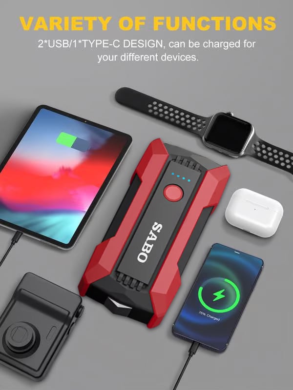 SECURE CLAMP DESIGN - This jump starter has a very smart design. The cable of the SABO jump starter has 8 protection functions, such as spark-proof, which means it won't cause sparks even when wrongly connected. The beep and flashing light design will notify you if there is a safety problem with the clamp.